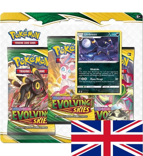 Ein 3-Pack-Blister (Version Umbreon) des Erweiterungs-Sets „Evolving Skies“ aus der Pokemon Sword & Shield Serie mit folgendem Inhalt: