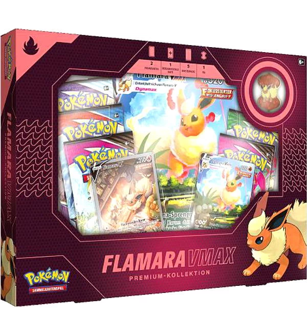 Stelle deine Kontrolle über die elementaren Gewalten mit den herausragenden Entwicklungen dieser Pokémon-VMAX-Premium-Kollektion unter Beweis! Flamara-VMAX verleiht die Macht des Feuers! Die Kollektion enthält eine wunderschöne Vollbildkarte, inklusive einer überdimensionalen Karte des begeisternden Pokémon-VMAX zum Ausstellen, einen Pin und fünf Boosterpacks.