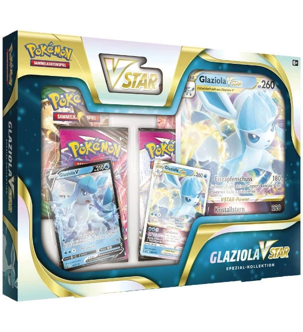 Zwei Evoli-Entwicklungen sind die Stars in den neuen Spezial-Kollektionen Pokémon-VSTAR. Folipurba-VSTAR und Glaziola-VSTAR sind bereit, die Kräfte von Pflanze und Eis zu nutzen, um mit ihrer einzigartigen, einmal pro Spiel einsetzbaren VSTAR-Power die Konkurrenz auszuschalten. Folipurba-V und Glaziola-V schließen sich Folipurba-VSTAR und Glaziola-VSTAR als holografische Promokarten an. Jede Spezial-Kollektion kommt außerdem mit Boosterpacks, einer VSTAR-Marke und mehr.