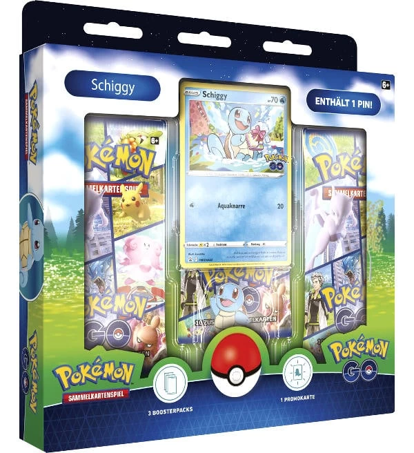 Die Pokemon GO – Pin-Box Schiggy (deutsche Version) mit folgendem Inhalt: