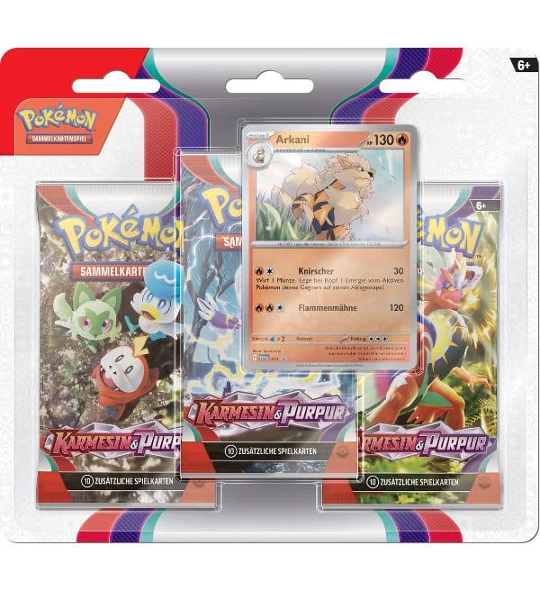 Ein 3-Pack-Blister (Version Arkani) des Pokémon Erweiterungs-Sets „Karmesin & Purpur“ mit folgendem Inhalt: