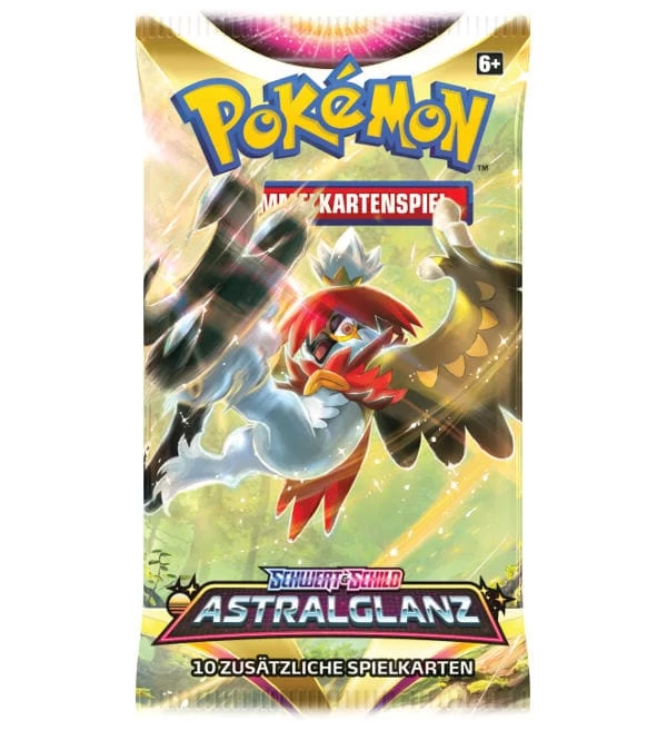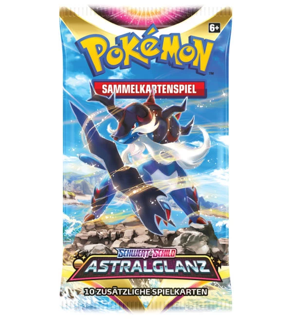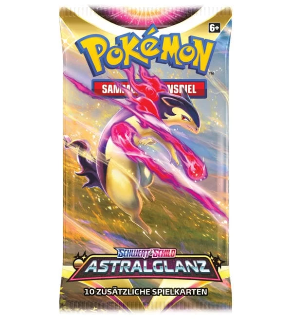 Ein Booster mit 10 Pokemon Karten aus dem Set „Schwert & Schild 10 – Astralglanz“. Die Auswahl des Artworks erfolgt zufällig.