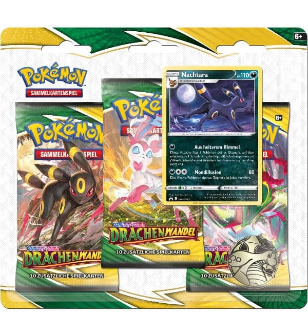 Ein 3-Pack-Blister (Version Nachtara) des Erweiterungs-Sets „Drachenwandel“ aus der Schwert & Schild Serie mit folgendem Inhalt: