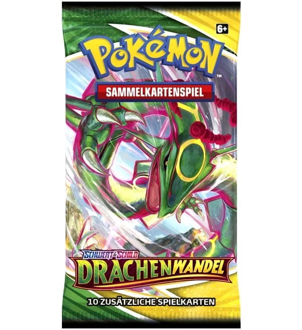Ein Booster mit 10 Pokemon Karten aus dem Set „Schwert & Schild 7 – Drachenwandel“. Die Auswahl des Artworks erfolgt zufällig.