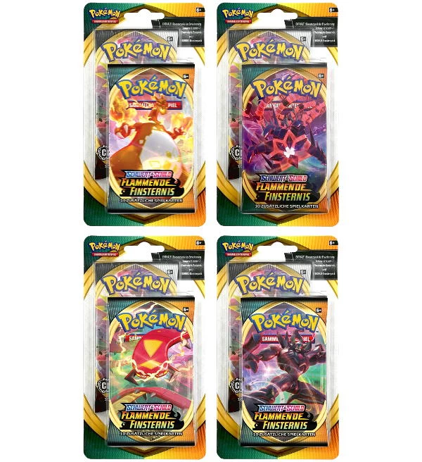 4 x 2-Pack-Blister mit allen 4 Booster-Artworks des Erweiterungs-Sets „Flammende Finsternis“ aus der Pokemon Schwert & Schild Serie mit folgendem Inhalt: