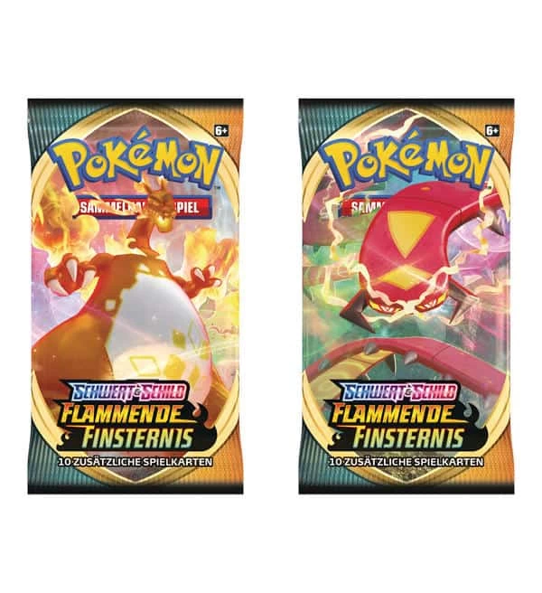 Ein original eingeschweißtes Display mit 36 Tüten (=360 Karten) des Erweiterungs-Sets „Flammende Finsternis“ aus der Pokemon Schwert & Schild Serie. Jede Tüte enthält 10 Karten.