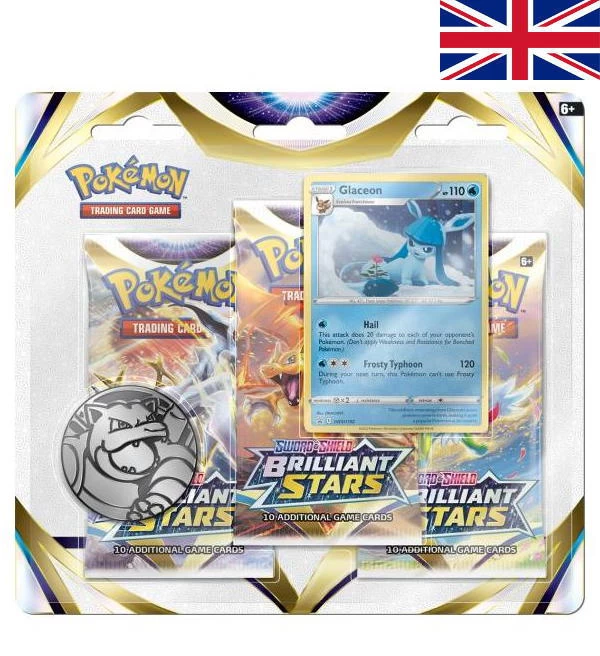 Ein 3-Pack-Blister (Glaceon) des Erweiterungs-Sets „Brilliant Stars“ aus der Pokemon Sword & Shield Serie mit folgendem Inhalt: