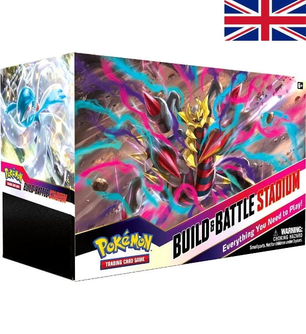 Die Build & Battle Stadium Box (Englisch) zum Erweiterungs-Set „Sword & Shield 11 – Lost Origin“ des Pokémon-Sammelkartenspiels mit folgendem Inhalt: